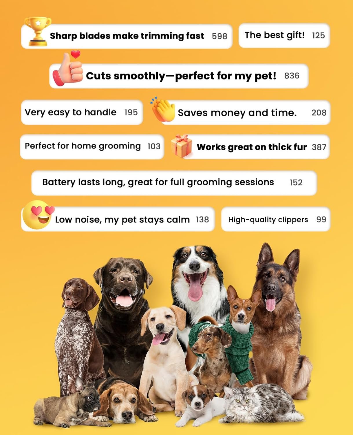 The oneisall Dog Grooming Kit delivers professional-quality grooming at home. Its quiet, cordless, and waterproof design, combined with multiple combs and paw trimmers, makes it perfect for thick, long-haired, or sensitive pets. While occasional blade issues may arise, overall, it’s a versatile and reliable choice for pet owners seeking convenience and comfort.